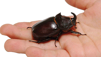 The scary looking rhinoceros beetles are among the largest beetles. Although they may grow to more than 150 millimeters, or 6 inches long, they are completely harmless to humans since they do not bite or sting. The claim to fame of these beetles is the horns, one projecting from each side of the thorax (section behind the head), and another one pointing forward from the centre of the thorax. These insects are sort of the Triceratops (horned dinosaur) of the insect world!